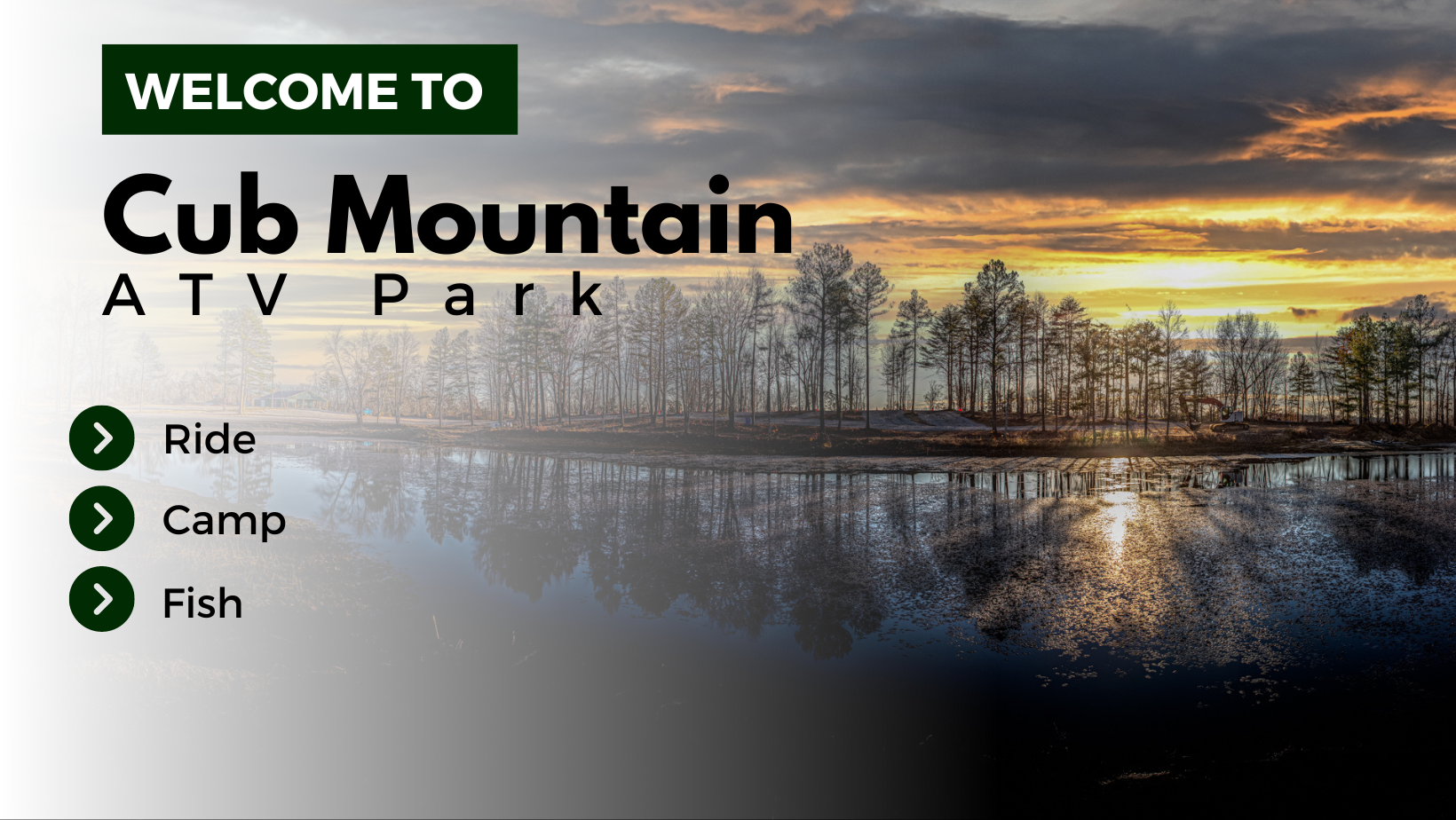 View Park Rules & RegulationsCub Mountain ATV Park & Campground is the ultimate spot for outdoor lovers and families. Enjoy 50 miles of exciting trails amid beautiful waterfalls, creeks, and ponds. Explore historical coal mining sites and scenic overlooks. Our stocked pond is perfect for catch-and-release fishing, and don’t miss the full-service restaurant with outdoor dining. With clean restrooms and a covered picnic area, Cub Mountain ensures your comfort. Experience thrilling off-road adventures and nature’s tranquility. Note: Jeeps, trucks, and SUVs are not permitted on the trails.